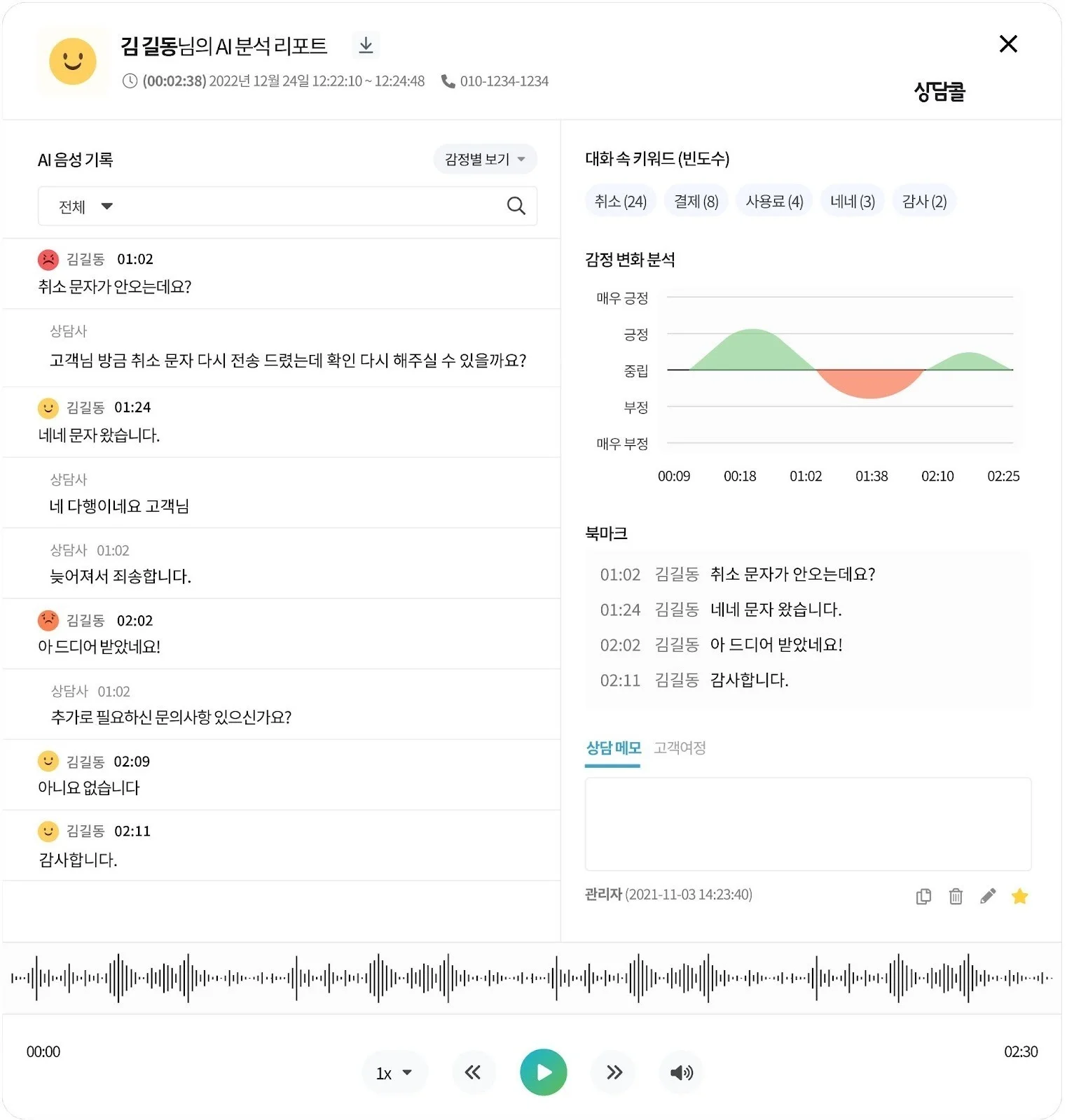 전화 상담 중 고객의 감정을 분석하는 기능을 제공합니다.