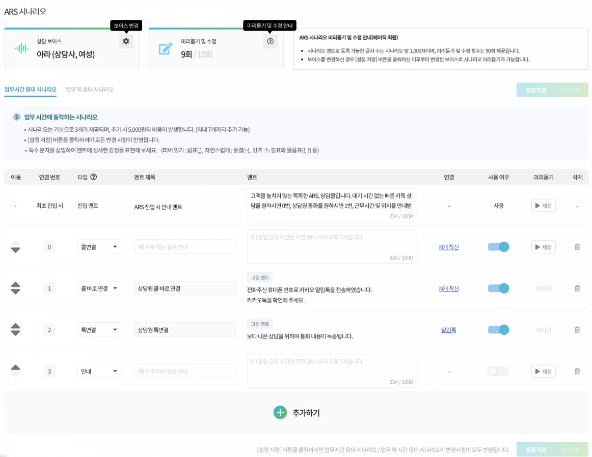 추가로 업무 시간 내 응대 시나리오와 업무 시간 외 응대 시나리오를 나눠서 설정할 수 있어요. 상황에 따라 다양한 시나리오를 저장해두면 그때 그때 알맞게 사용할 수 있겠죠?