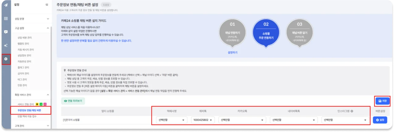 [설정 > 주문정보 연동/채팅 버튼 설정] 메뉴에서 쇼핑몰을 연동해주세요.