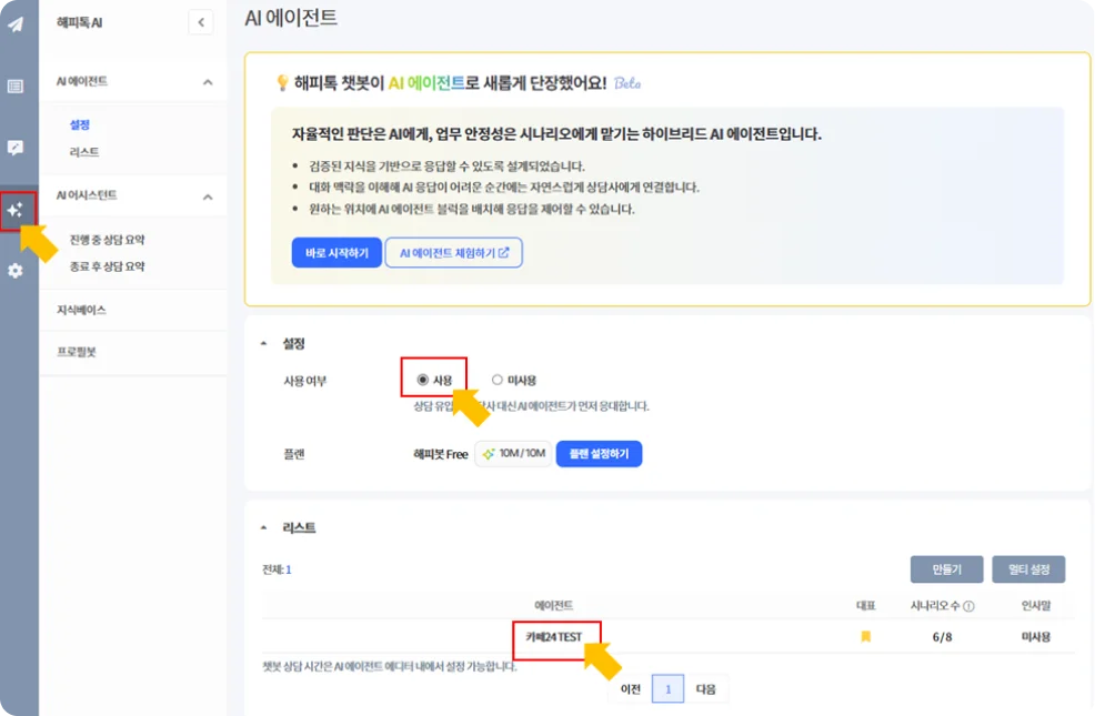 AI 에이전트(챗봇) 사용 여부를 ‘사용’으로 처리 하면 회사명으로 기본 에이전트가 생성됩니다.
