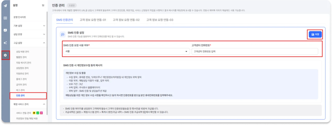 [설정 > 고급 설정 > 인증 관리] 메뉴에서 SMS 인증 요청 사용 여부를 선택하고 고객센터 전화번호를 입력해주세요.