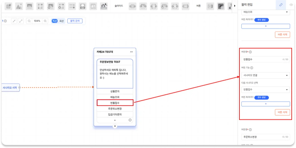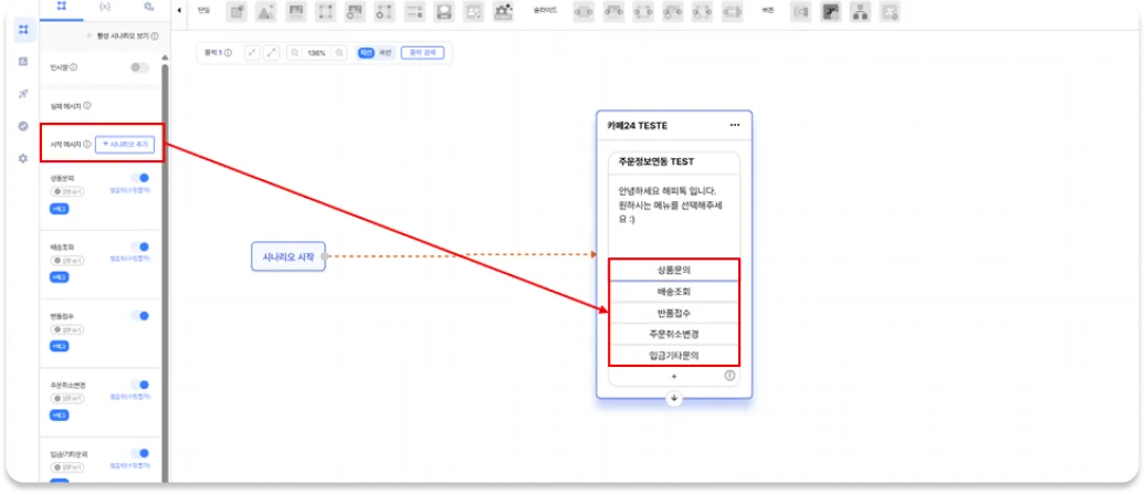 문의 유형별 버튼이 생성되어 있고, 시나리오도 연결되어 있습니다. 버튼 순서 변경도 가능해요.