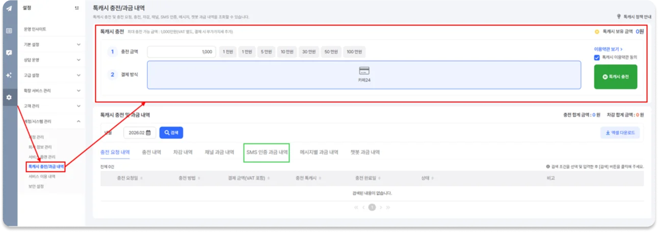 고객 주문정보 조회 시 발생하는 SMS 인증 비용을 위한 톡 캐시를 충전해주세요.