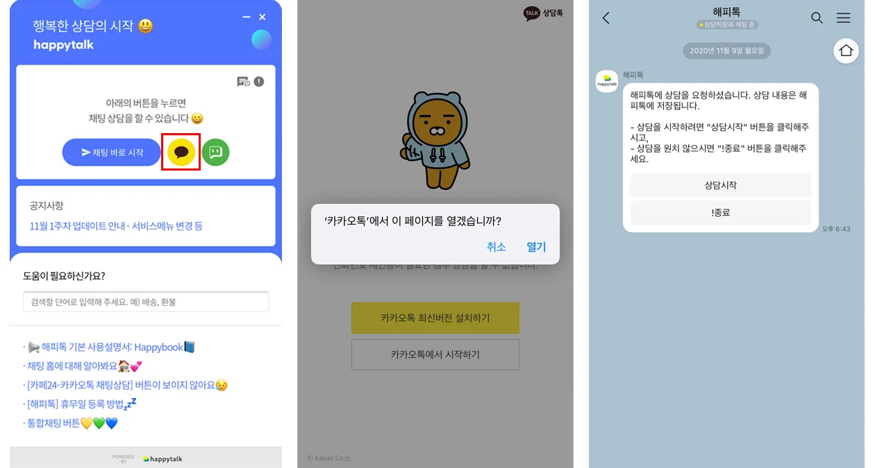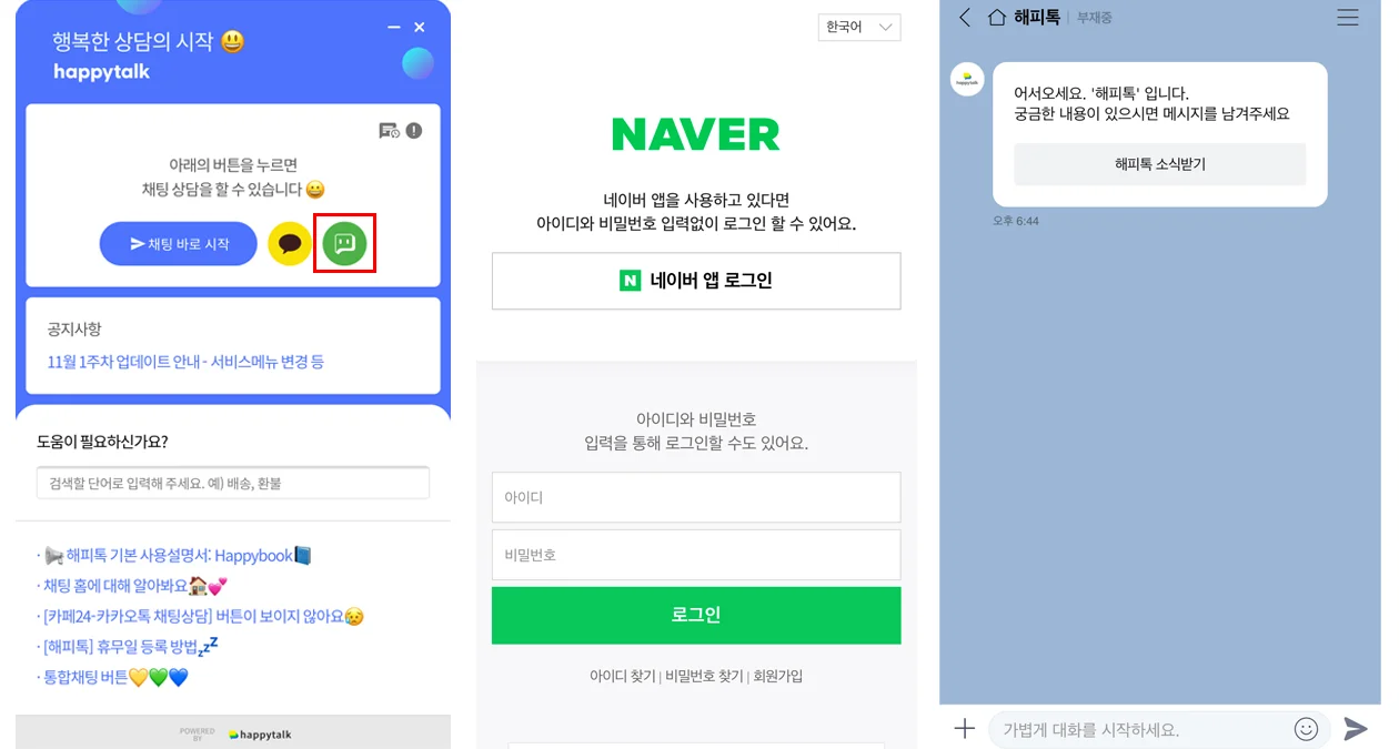이게 바로 해피톡 둥둥이 버튼(플로팅 버튼)인데요. 여길 클릭하면 카카오 상담톡, 네이버톡톡, 해피톡 웹채팅 등을 통한 채팅상담이 가능합니다.