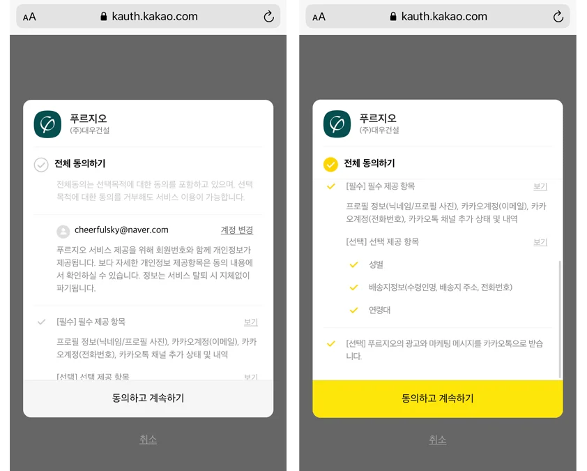 마케팅 메시지 발송 동의는 물론, 카카오톡 채널 친구 추가까지 한번에 가능해 타깃 마케팅에 유용해요.