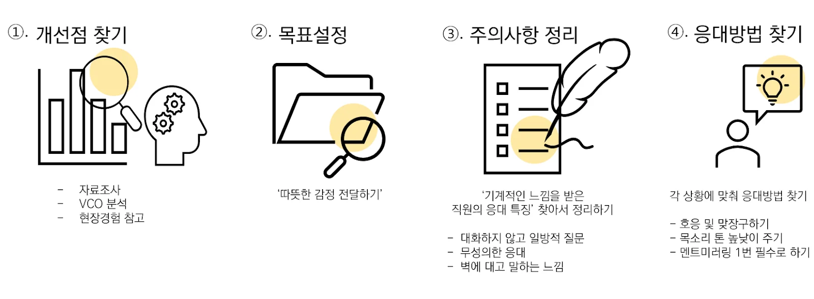 자료 조사를 통해 3가지를 알 수 있다. 그렇다면 지금부터 각각의 상황에 맞는 응대 방법을 찾으면 된다.