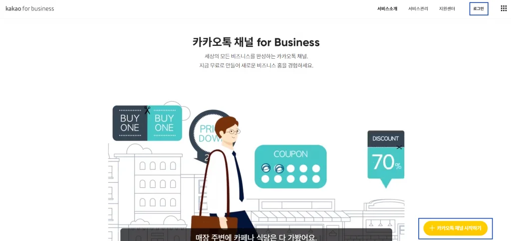 오른쪽 상단의 ‘로그인’ 이나 하단의 ‘카카오톡 채널 시작하기’ 를 눌러주세요.