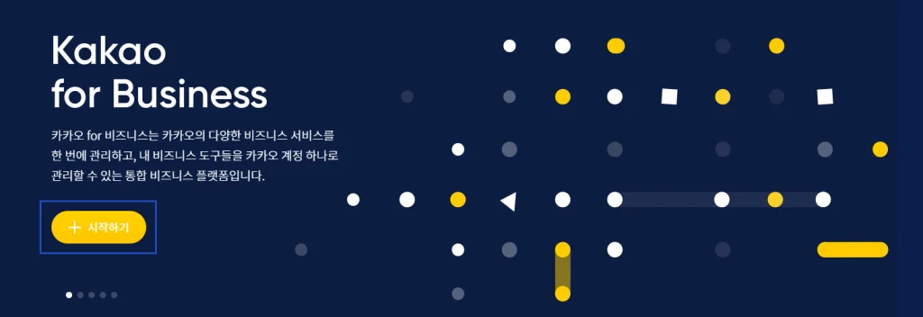 로그인 후, Kakao for Business 메인 배너의 ‘시작하기’ 버튼을 누르거나 카카오 비즈니스 대시보드에 직접 접속합니다.