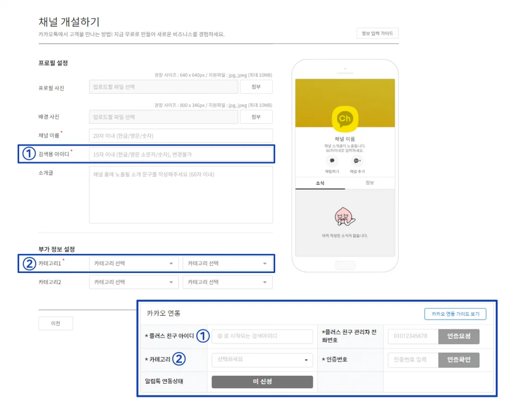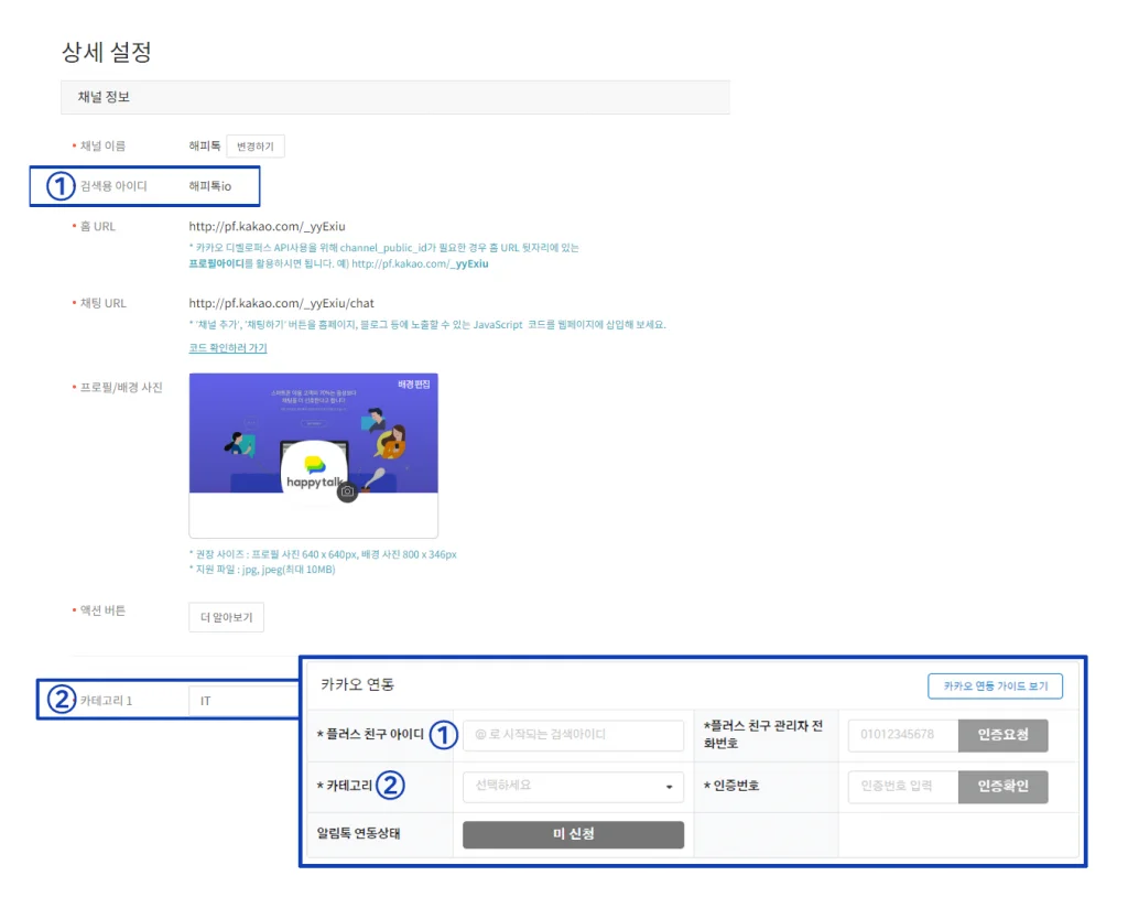 ‘검색용 아이디’를 카카오 연동의 ‘플러스 친구 아이디’ 로, ‘카테고리 1’을 카카오 연동의 ‘카테고리’ 로 선택해 입력하신 다음 플러스 친구 관리자 전화번호로 인증만 받으시면 끝! 🎉🎉