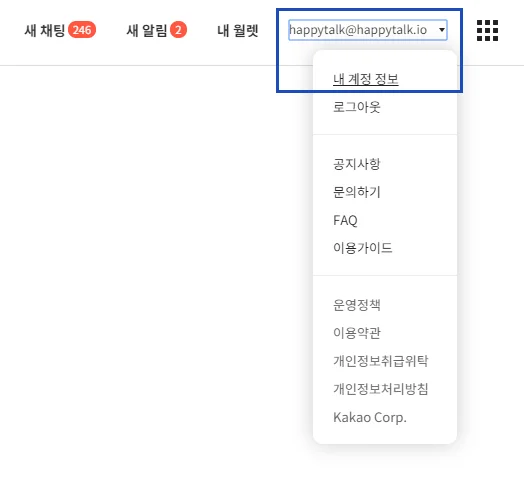 카카오톡 채널 관리자 센터에 로그인하신 다음, 오른쪽 상단의 로그인 아이디(이메일 주소)를 클릭해 ‘내 계정 정보’ 를 눌러주세요.