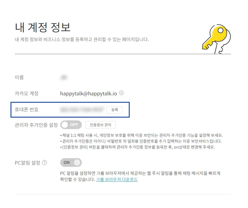 여기에 등록된 전화번호가 상담콜 친구 가입에 필요한 ‘플러스친구 관리자 전화번호’ 인데요,사용하지 않는 번호가 등록되어 있다면 오른쪽의 ‘등록’ 버튼을 눌러주세요.