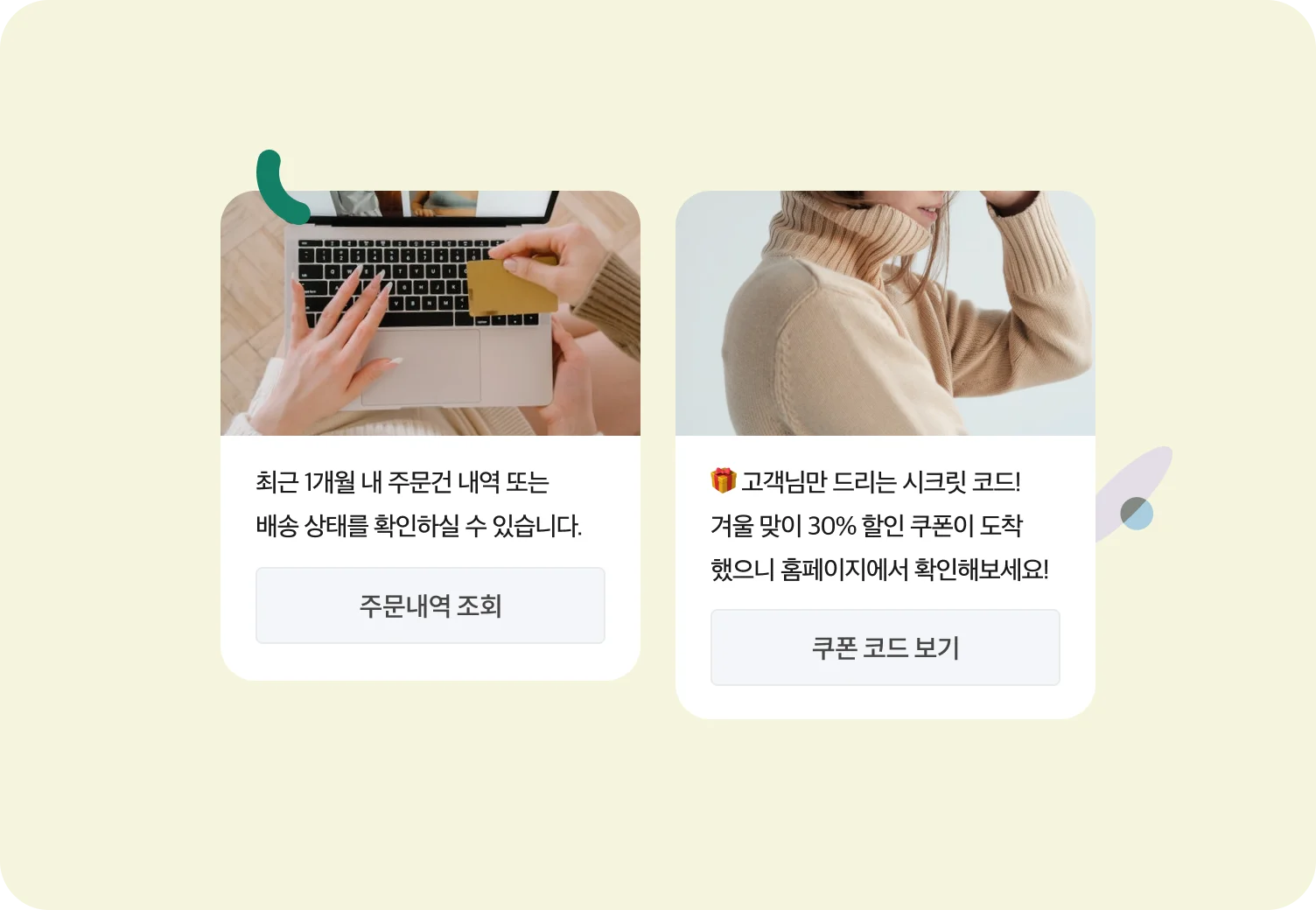 그리고 고객에게 장바구니 상품을 리마인드 시켜줄 수도 있는데요. 찜해둔 상품에 대한 이벤트를 알려주거나 구매를 망설이는 고객에게 구매 욕구를 불러일으키는 트리거 메시지를 보낼 수 있어요. 고객 유출을 막고 충성 고객을 만드는 데 도움이 될 수 있겠죠?