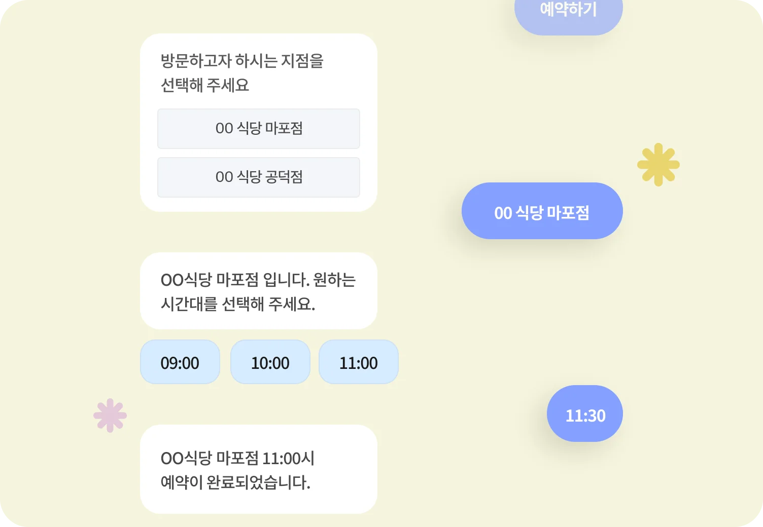 식품 서비스 업종이라면 챗봇을 예약 문의 및 확인용으로 사용할 수 있어요. 챗봇에 지점과 일시 등 원하는 항목을 만들어 예약 시스템을 구축할 수 있죠. 여기에 더하여 메뉴 안내 메시지를 보내거나 위치 및 운영 시간 등 단순 고객 응대에 대비할 수 있답니다.
