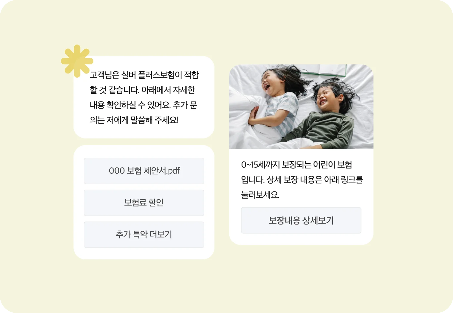 보험 업종이라면 고객에게 좋은 상품을 소개할 수 있어요. 고객 층을 분류하고 분류별로 메시지를 다르게 해 가입 유도를 더 늘리는 거죠. 매번 상담사가 불특정다수에게 전화를 걸어 영업하던 이전 방식보다 훨씬 효율적이겠죠?