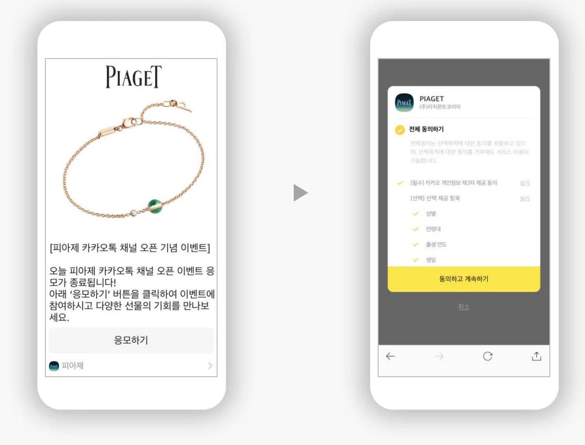 2. 이를 해결하기 위해 피아제는 오프라인 매장에서 카카오톡 채널 추가를 쉽게 유도하는 프로모션을 기획했다. 그 결과 매장 방문 고객 10명 중 8명을 놓치지 않을 수 있었다. 이후 꾸준한 고객 관리를 통해 이탈률을 줄인 건 덤!