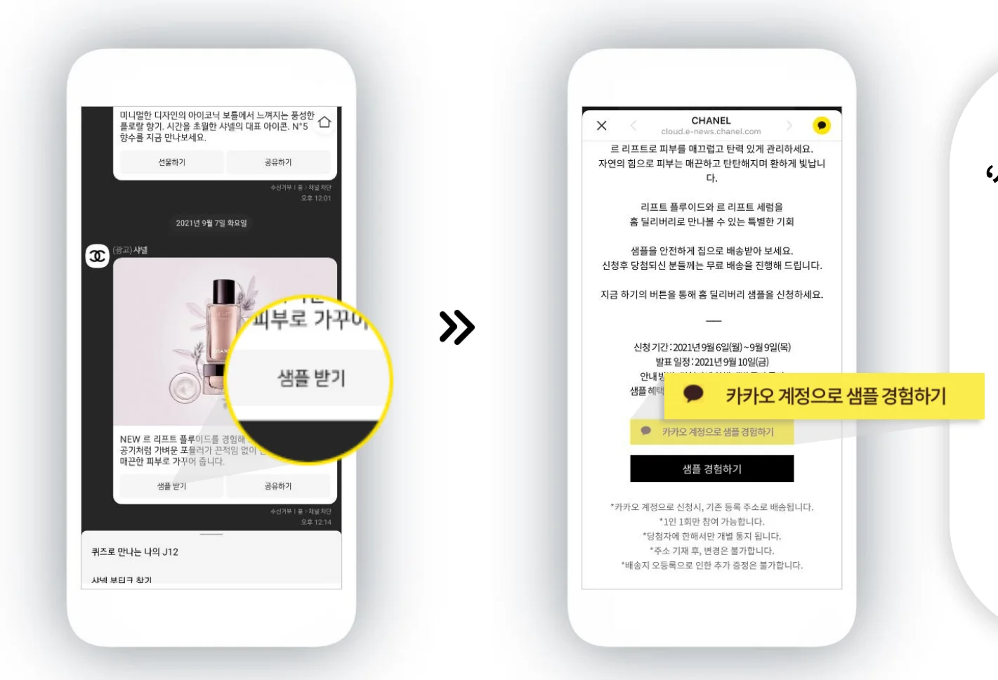 3. 샤넬은 향수 샘플 증정 이벤트를 카톡 채널에서 열었다. 향수를 증정받기 위해 데이터 수집에 동의하는 설정 그리고 증정은 오프라인 매장에서 하도록 기획했다. 그 결과 고객 데이터도 확보하고, 오프라인 매장으로 고객 유입도 늘릴 수 있었다.