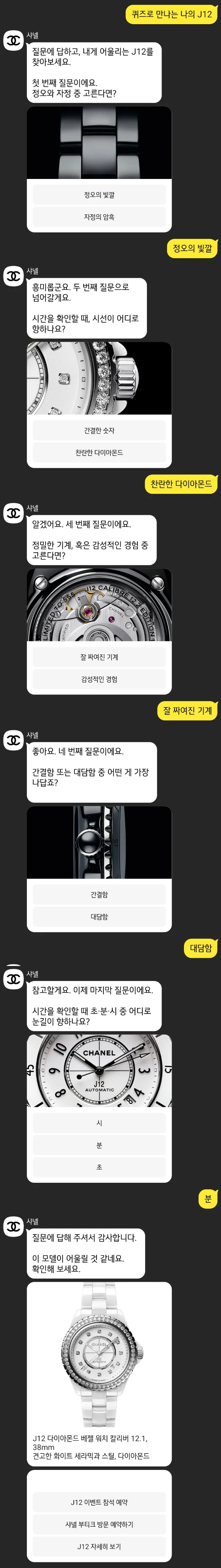 4. 샤넬은 오프라인 매장 직원의 전문성도 살리고, 고객 참여를 쉽게 하기 위해 <퀴즈로 만나는 나의 J12> 이벤트를 기획했다. 심리 테스트 형식의 시나리오를 통해 흥미를 유발해 고객 참여를 쉽게 이끌어냈다. 또한 챗봇 통계를 통해 고객이 가장 선호하는 모델에 대한 데이터도 확보할 수 있었다.